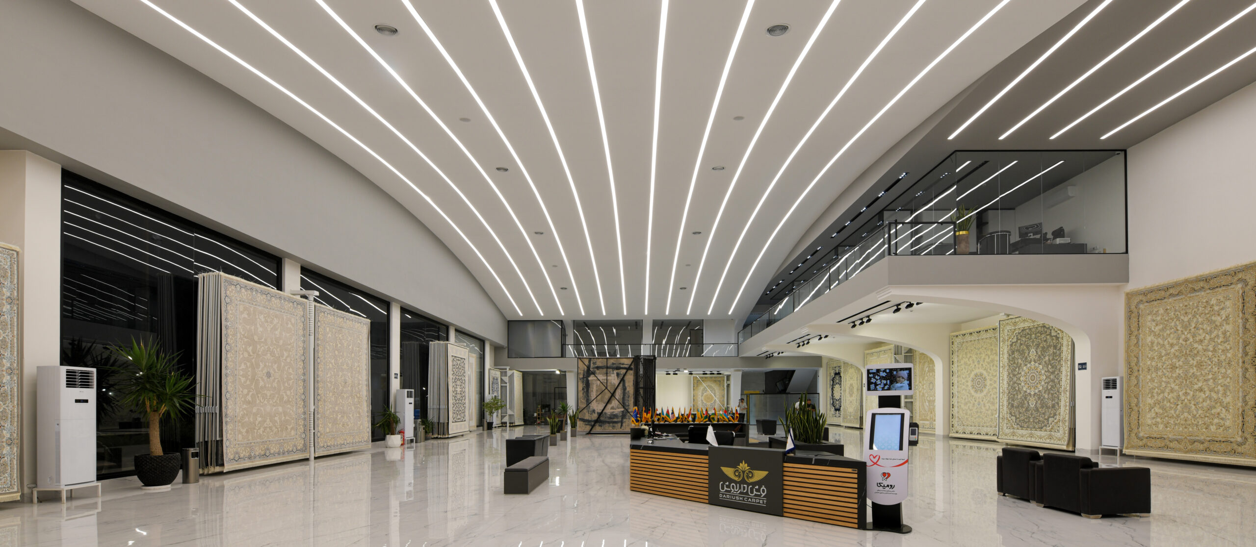 یکی از پیچیدهترین حالات نورپردازی، نورپردازی با استفاده از چراغ خطی توکار منحنی و کرو به صورتی است که انحنای چراغ در راستای محور عمود بر افق ( محور Z ) باشد. با تلاش بی دریغ تیم طراحی و واحد تولید اکووات و مهندسی دقیق بخشهای مختلف پروژه، نورپردازی فروشگاه فرش داریوش کاشان، با استفاده از چراغ خطی توکار کرو، به صورت دقیق اجرا گردید. چراغ خطی ماژولار استفاده شده در این پروژه علی رغم ارتفاع زیاد نصب، فضا را به خوبی نمایش داده و علاوه بر این، با داشتن شاخص نمود رنگ فوقالعاده (CRI>95)، رنگهای واقعی فرشهای قرار گرفته در فضا به نمایش گذاشته شد. تنظیم ورودی برق و سیمکشی چراغهای خطی این پروژه به صورتی است که میتوان قسمتهای مختلف آنرا به صورت جداگانه خاموش و روشن نموده و از این طریق، در ساعات مختلف شبانهروز و بسته به نور ورودی از پنجرهها، سطح نور فروشگاه را تنظیم نمود.